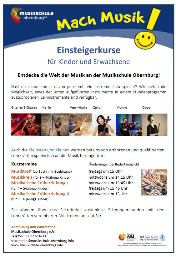 Die Musikschule Obernburg e.V. ist eine öffentliche, also allgemein zugängliche Einrichtung. sichert ihren Schülern einen qualifizierten und kontinuierlichen Unterricht zu. bietet Elementarfächer, ein breitgefächertes Angebot an Instrumental- und Vokalunterricht sowie eine Vielfalt von Ensemblefächern verschiedenster Besetzungen an. hat außerdem Ergänzungsfächer und Projekte im Angebot. trägt mit ihren Veranstaltungen zum örtlichen Musikleben bei. qualifizierte, staatlich geprüfte Lehrkräfte gewährleisten hochwertigen und zuverlässigen Unterricht für alle Alters- und Leistungsstufen. Über 800 Schüler besuchen derzeit die Musikschule, die jüngsten Musikschüler sind 18 Monate, die momentan ältesten Schüler 70 Jahre. erzielt keine Gewinne, sondern ist als gemeinnützig anerkannt. kann (in begrenztem Umfang) Leihinstrumente zur Verfügung stellen. informiert und berät auf Wunsch - kostenlos und unverbindlich. gehört dem Verband Bayrischer Sing- und Musikschulen (VbSM) mit ca 220 Mitgliedsschulen und dem Verband deutscher Musikschulen (VdM) mit nahezu 1000 Musikschulen an. sieht das gemeinschaftliche Musizieren in einem vielfältigen Spektrum als zentrale Aufgabe. bietet Kindern, Jugendlichen und Erwachsenen individuelle Wege an um aktiv am Musikleben teilzunehmen, sich musisch zu bilden und zu entfalten, indem Altes bewahrt und Neues entdeckt wird. uvm. Diese Qualitätsmerkmale sind nicht zum Nulltarif zu haben. Die staatliche Förderung kann hier nur Anreize bieten, die finanzielle Hauptlast werden auch weiterhin die Eltern sowie die Stadt Obernburg tragen. Dass für diese Dienstleistung immer noch ein großer Bedarf besteht, zeigt unsere nach wie vor hohe, konstante Schülerzahl.